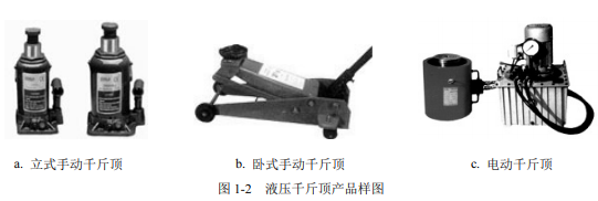 在實(shí)際應(yīng)用中,千斤頂?shù)漠a(chǎn)品設(shè)計(jì)形式是多種多樣的,可以滿足不同場(chǎng)合下的應(yīng)用。在較小噸位時(shí),常用的有立式手動(dòng)千斤頂(如圖 1-2(a)所示)、臥式手動(dòng)千斤頂(如圖 1-2(b)所示);在較大噸位時(shí),一般采用電動(dòng)千斤頂(如圖 1-2(c)所示)。如果將圖 1-1 所示系統(tǒng)中的油液介質(zhì)換成空氣介質(zhì),因?yàn)榭諝饨橘|(zhì)直接取自大氣,并直接排入大氣,所以不需要圖示中的回油管與油箱裝置,其他元件的結(jié)構(gòu)與原理類似,圖示系統(tǒng)就可視為一個(gè)氣壓傳動(dòng)系統(tǒng)。例如,生活中常用的打氣筒,就與上述小活塞缸工作原理完全相同。