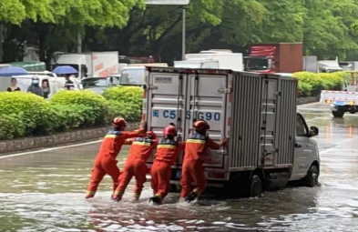 泉州暴雨,消防員用機(jī)械千斤頂頂起面包車